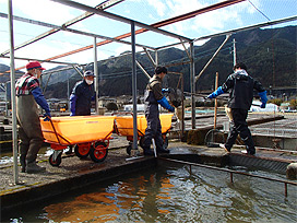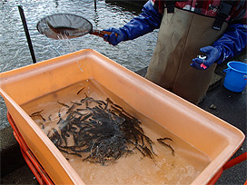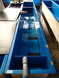 下呂支所では、主に屋外の飼育池でアマゴやニジマスなどを飼育しています。魚が混みあっている飼育池では病気が発生しやすくなるので、個体数や体サイズに応じて、より大きい池に魚を移し替えるか、いくつかの池に分けて飼育するようにしています。
