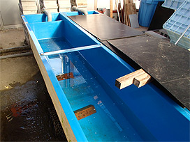 下呂支所では、魚の飼育には井戸水と河川水を使用しています。ただし、井戸の水量に限度があるため、大部分の魚の飼育には河川水を使用しています。