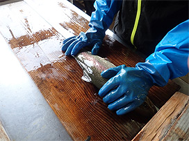同じ系統の同じ年齢のニジマスで、かつ同じ池で飼育してきたものであっても、成熟の時期には個体差(最大で1ヶ月ほど)が生じます。そのため、親魚の成熟度合いを毎回確認して、採卵可能な個体だけを選び出して採卵と人工受精を行うようにしています。