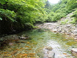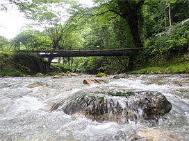 水産研究所では、現在、天然遡上のないダム上流用の放流アユ種苗の開発を行っています。作出した種苗について、その特性を調べるために、調査河川に放流しました。