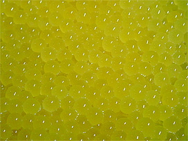 発生の最終段階の卵は、発現した眼球が透けて見えることから「発眼卵」と呼ばれます。卵は、受精後しばらくの間は安静が必要ですが、発眼卵の段階になると外部からの衝撃に比較的強くなり、収容水槽から取り出すことができるので、生卵と死卵とを分別する作業が可能になります。死卵は、放置すると水カビ発生の原因となるので取り除かなければなりません。