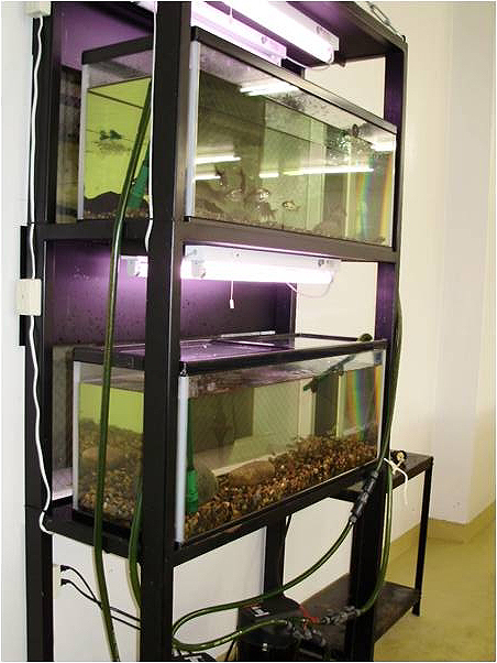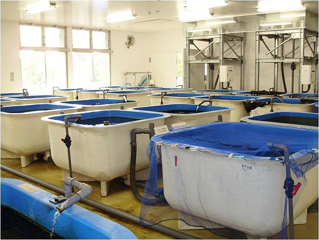 小型のFRP水槽を使用して、タナゴ類などの飼育や実験を行っている部屋です。井戸水や循環水のほか、加温・冷却した飼育水も使用することができます。通路側の展示水槽は、一般の来所者の方も見学可能です。