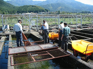 計16区画の中型のコンクリート池です。ここでは主にA号池で育成した後のアマゴ・ヤマメなどの