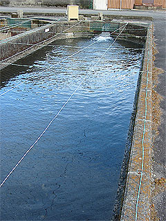 魚を収容して、成熟するまで飼育しています。飼育水は A・B号池を通った水に飛騨川の水を