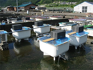 一部の区画には 大小各種のFRP水槽を設置して、アマゴやヤマメなどの稚魚の育成に
