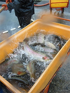 採卵用のニジマス親魚を飼育しており、採卵時期に魚を