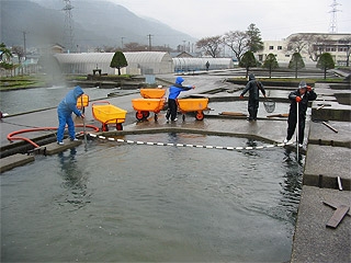 雌雄の判別や未成熟魚の分別のため、複数の大型区画を適宜使い分けています。また、